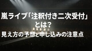 嵐25周年ライブ上映の「注釈付き指定席」二次受付について、見え方の予想から当選確率を上げる申し込み戦略、落選組の救済措置までを徹底解説。連番で狙う際の注意点も紹介します。